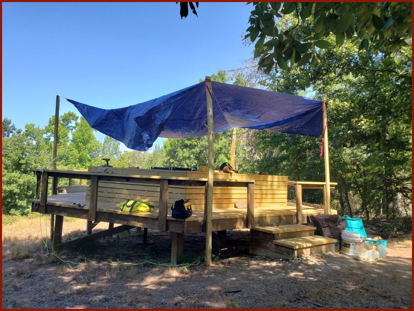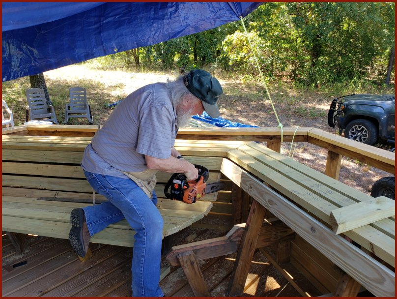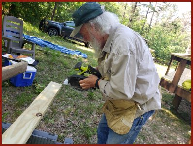 of the middle bench to their proper lengths, and Jason hung a large tarp between a tree and a vertical 2x4 stuck in the