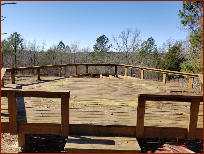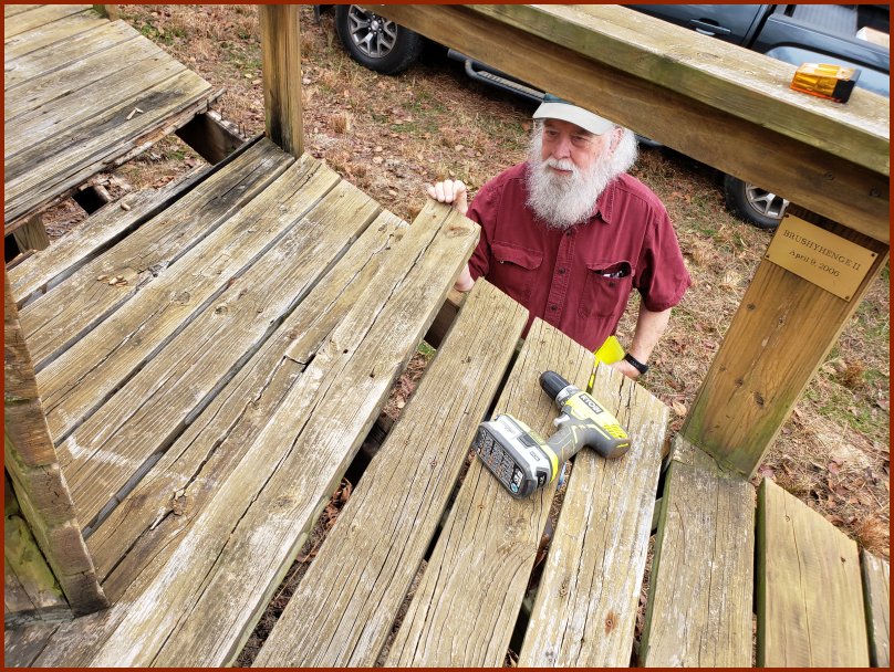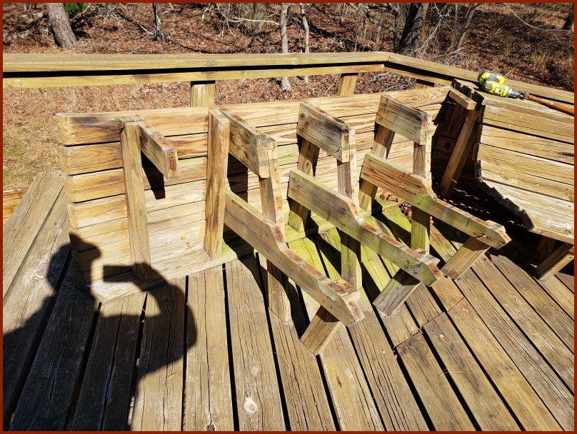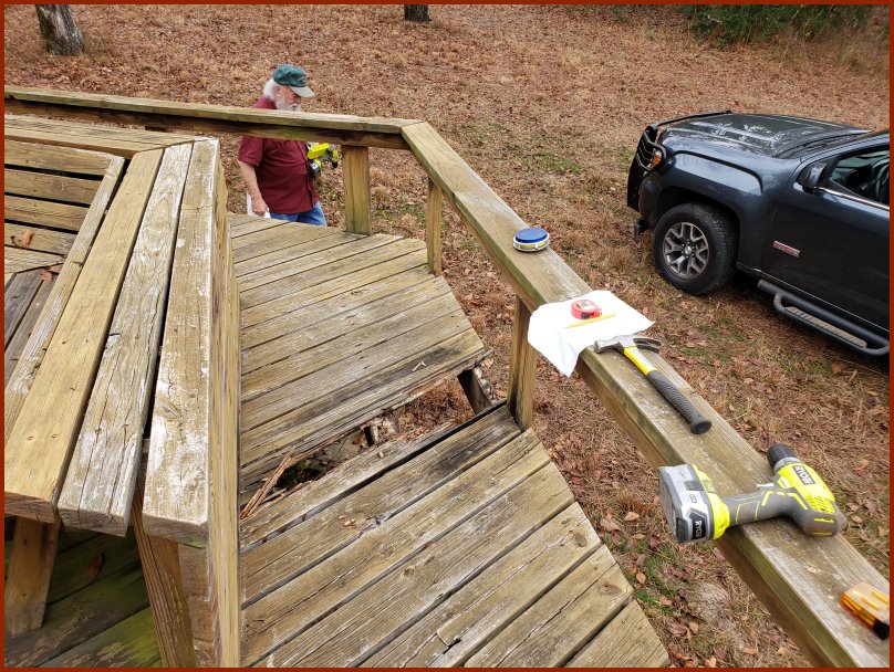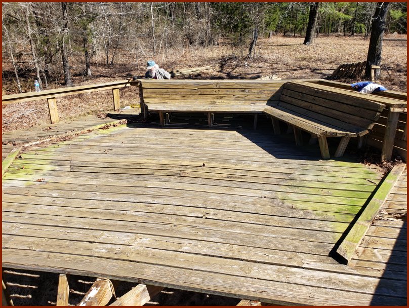 the top boards of the railing. Next we'll replace the wooden steps, and then rebuild the benches. Before we left the land we shot some