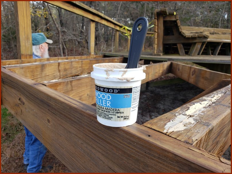 appropriate wood filler to fill the holes. Dad will soon purchase the new lumber from Smith Lumber in nearby Athens, Tx. We'll have