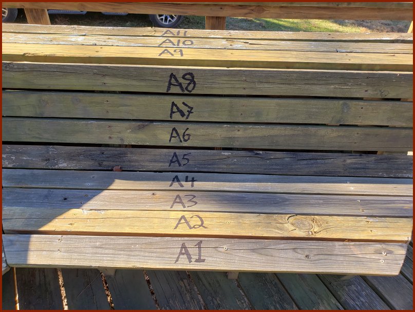 5 benches. First we labeled each board in case we need to use them as templates or memory joggers later. The 3 h-shaped braces under