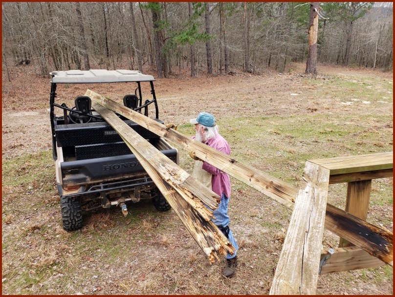 expected. It's tiring work, but a lot of fun too. We load the old boards in the MUV and drive them off into the woods where they will