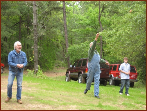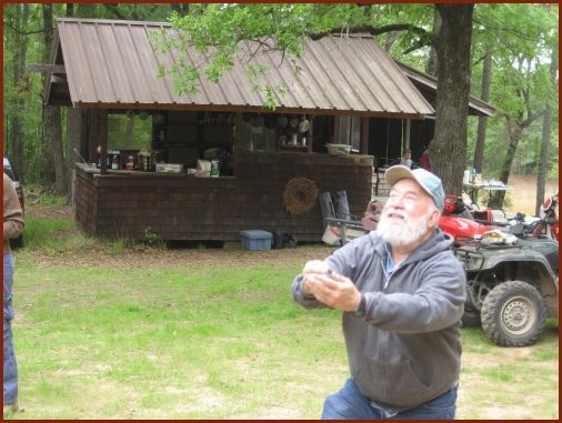 Glen tosses an egg. If you look closely you can spot the brown egg in flight.