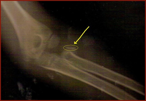 her to Children's Hospital in Dallas where they took the above X-ray of her elbow. Notice the small piece of
