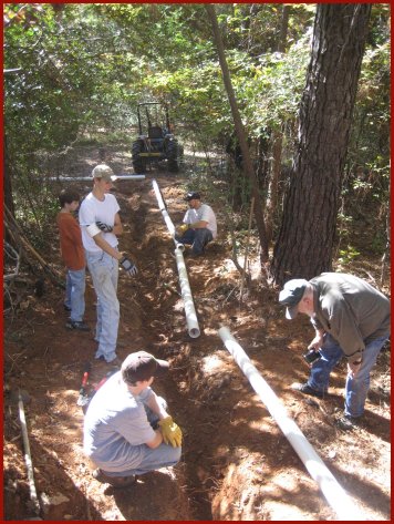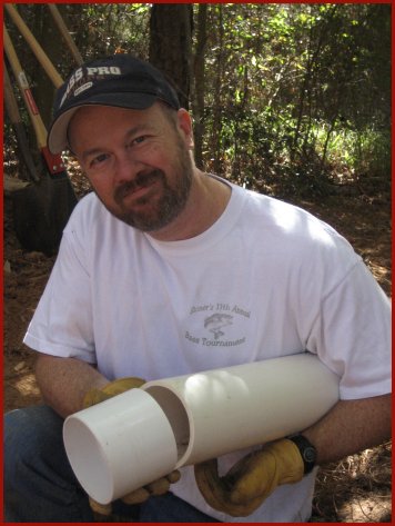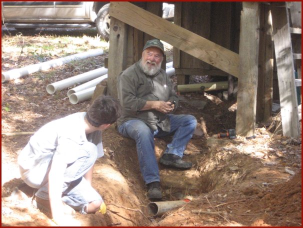 Fixin' to bury our new sewer pipe. The picture on the right is of me when I noticed that we bought the wrong couplers.
