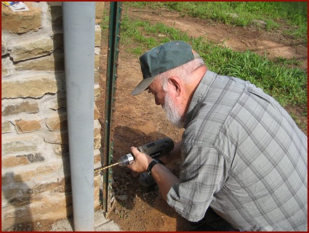 through three cordless drill batteries, but eventually we got the holes drilled for the hinges. The pipe is on the