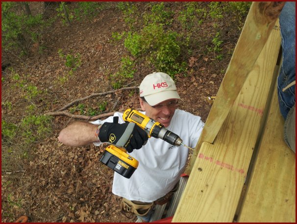 Jason attaching a rail support. I miss the soothing sound of hammers in the woods - there's nothing like it.