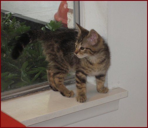 Tiger watches his friend from one of his favorite window sills. Josie was a very, very playful kitten and would