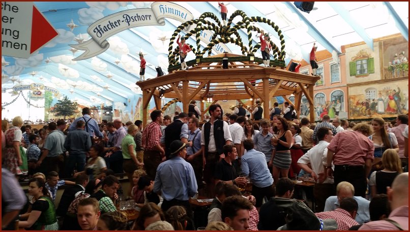 Inside the Hacker Pschorr tent. The beer tents hold 5,000 people each. Over half the folks in the Hofbrau tent