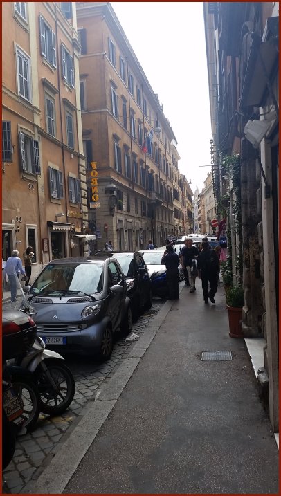 A very typical Roman street. Every few blocks there's a square ("piazza") which often has ornate fountains, people