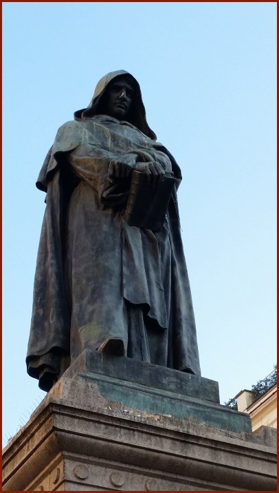1600, Bruno was burned alive here by the Catholic Church for not believing in the divinity of Christ. Many others