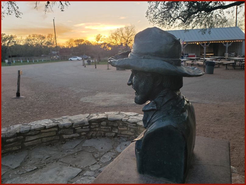 The bust of Hondo Crouch at sunset in Luckenbach, TX.