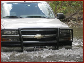 Chuck (left) and Dad (in the truck with Shelley & her daughter) crossing the Red River at the Goose Lake trailhead. The river