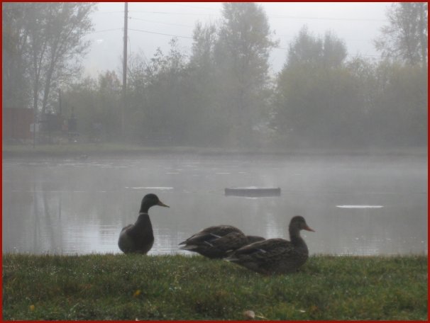 Ducks on a foggy morning near the Rio Colorado Lodge's trout pond