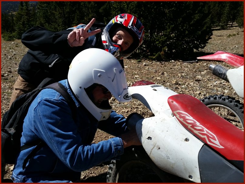 Chuck securing my loose SuperTrapp exhaust pipe with a bungee cord, as Jason "helps"
