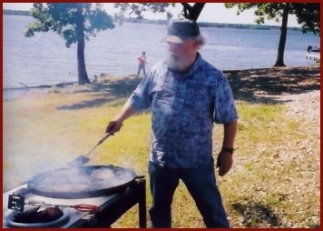 That's dad on the right cookin' burgers. He also cut up the onions and tomatos while I was